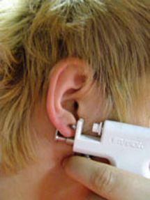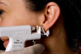 Przekłuwanie uszu . Metoda bezdotykowa, z zastosowaniem miejscowych środków znieczulających.